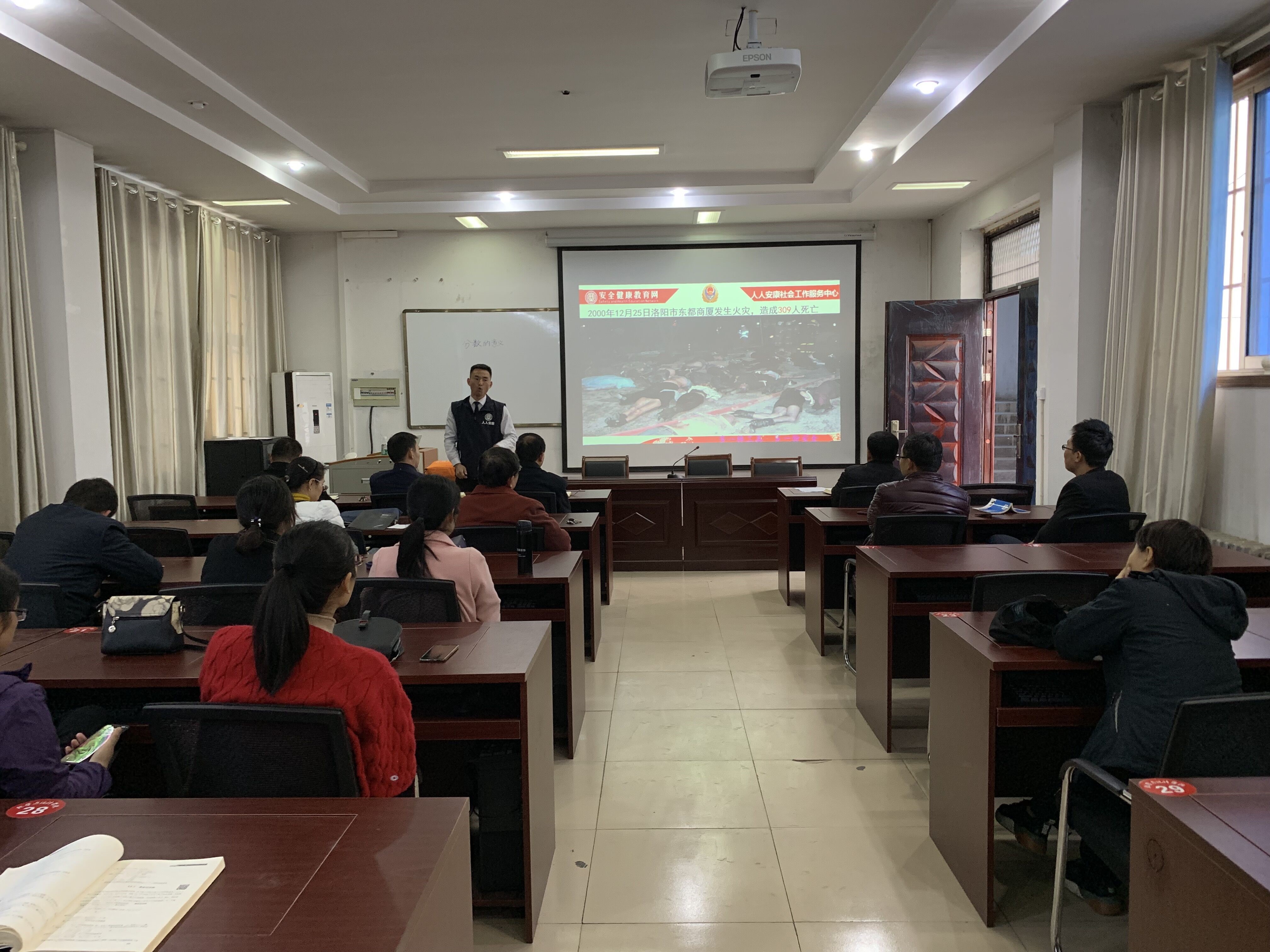 讲座伊始,教员赵超磊向全体人员介绍了此次讲座的目的及意义,为大家讲解了基本消防安全制度并简要介绍相关法律法规。接着向老师们介绍消防安全的相关知识,并对老师们的消防安全意识所存在的问题进行纠正,让老师们切实了解火灾产生的原因及其危害,并能够及时地采取应对措施。讲座最后,教员赵超磊通过实例向老师们展示了消防安全的重要性并对一些灭火器材的使用进行了基本的讲解。