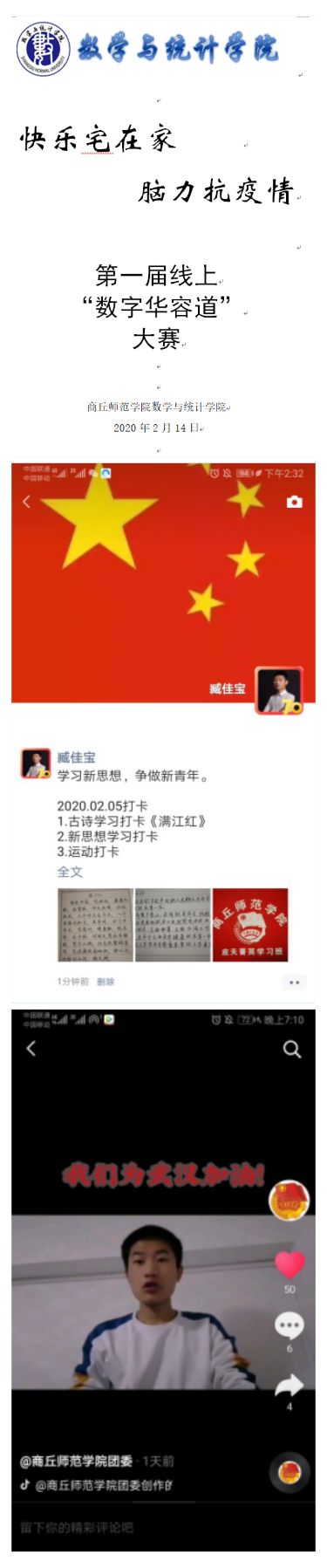 疫情期间,学院团总支学生会组织院系同学们利用手写祝福,手抄报,短视频等形式为武汉加油,祝愿祖国早日渡过难关。学生会主席臧佳宝号召大家做一个宅而不荒的青马人,每天学习新知识,观看并学习党的理论知识,写下心得体会,同时策划并组织“快乐宅在家,脑力抗疫情”第一届线上“数字华容道”大赛。