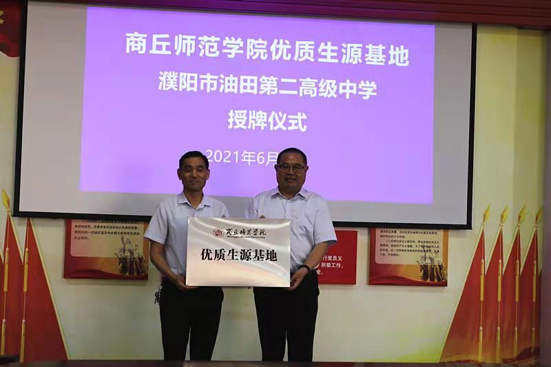 最后,孟学超代表学校分别和濮阳油田第二高级中学、濮阳县第一中学签订了优质生源基地合作协议书,授予濮阳油田第二高级中学、濮阳县第一中学优质生源基地牌匾并合影留念。