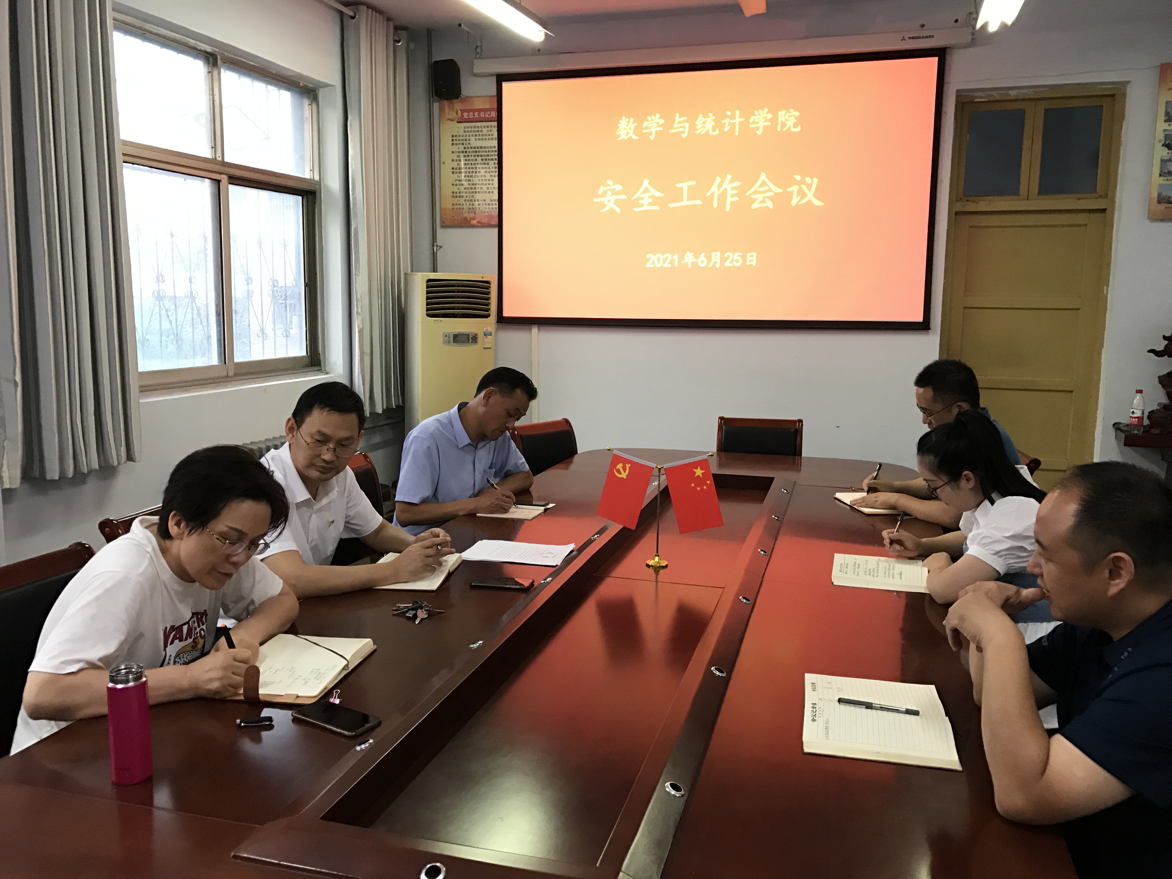 6月25日下午,数学与统计学院召开安全工作专题会议,会议传达了学校安全工作会议精神,研究部署学院的安全工作。学院班子全体成员、实验室主任、辅导员代表参加了会议。会议由学院党委书记孟学超主持。