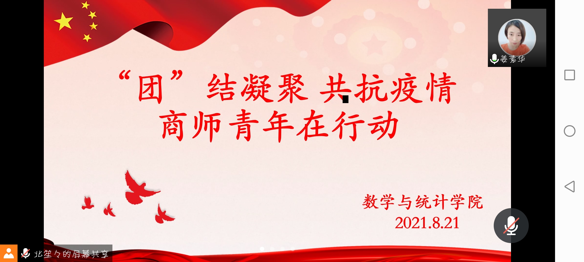为充分发挥基层团组织的战斗堡垒作用,进一步增加团员青年积极参与防控疫情的责任意识和战胜疫情的决心,williamhill中国于8月21日线上进行“‘团’结凝聚,共抗疫情,商师青年在行动”团日活动工作部署。本次活动由团总支书记姜素华主持,各班团支书和组织部成员参与。