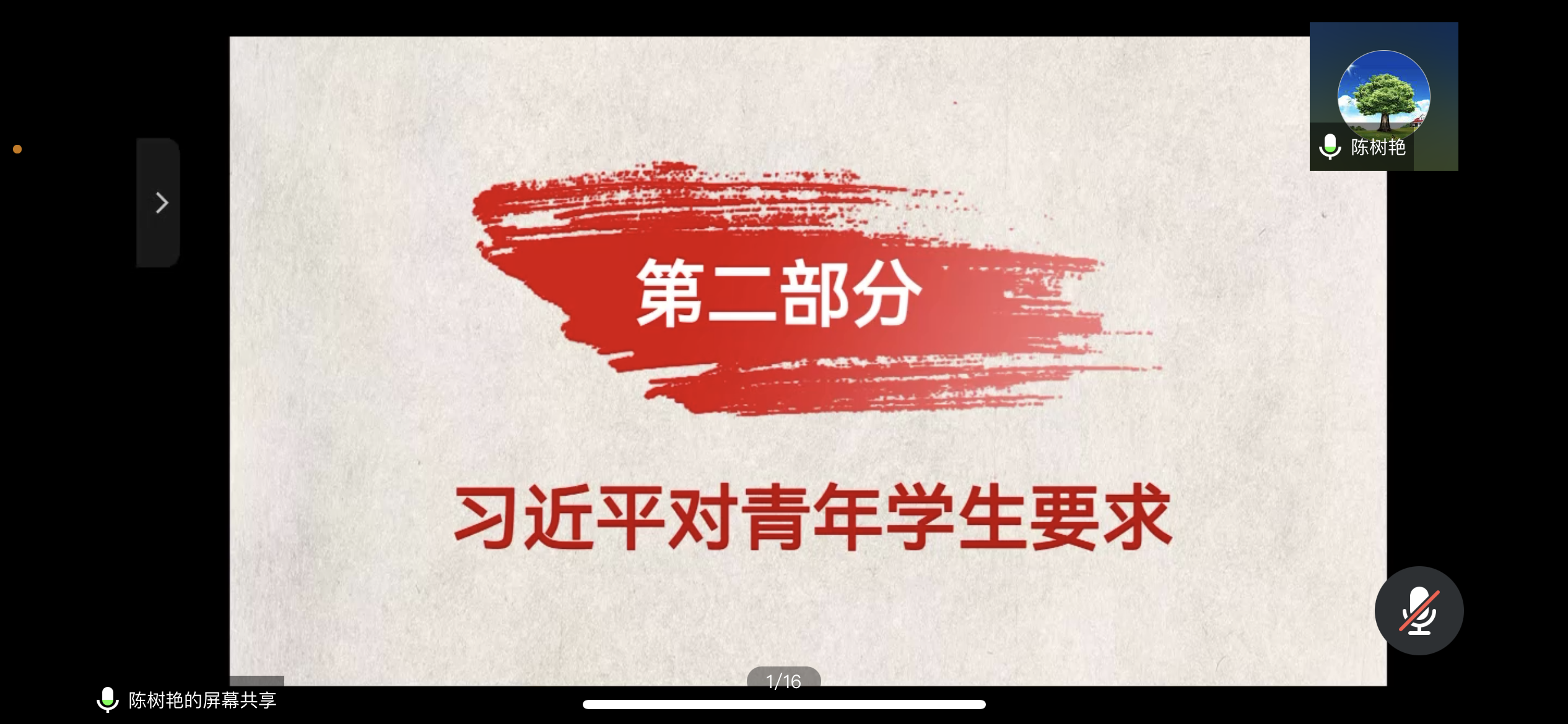 陈树艳副书记主要从三个部分展开讲解,即坚定理想信念 补足精神之钙、习近平总书记对青年学生要求、做一个新时代的优秀青年。首先,陈书记围绕习近平总书记讲话教导同学们要坚定理想信念,做一个有理想、热爱祖国、有责任担当、砥砺奋斗、有过硬本领的新时代优秀青年。