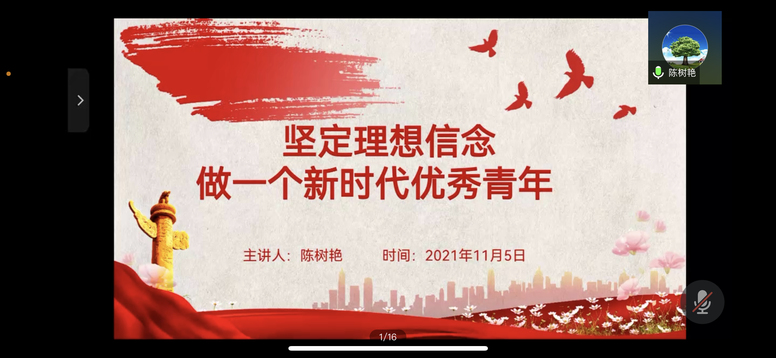 为提高入党积极分子的党性修养,进一步坚定其理想信念,williamhill中国于11月5日晚线上召开“坚定理想信念,做一个新时代的优秀青年”为主题的中级入党积极分子党课培训会议。本次党课由党总支副书记陈树艳主讲,全体中级积极分子参加。