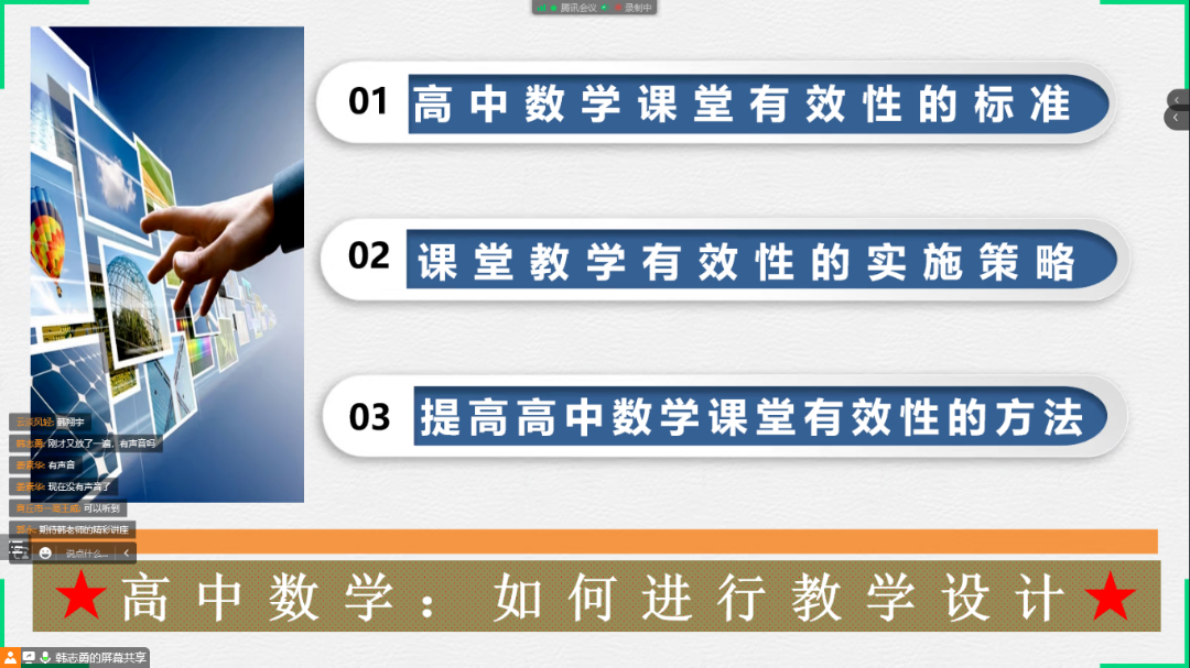 培训伊始,姜素华老师向学员们介绍了主讲人韩志勇老师的个人事迹,并讲述了本次培训的主题—高中数学如何进行教学设计。随后,韩志勇老师从“教学”一词的理解导入,围绕高中数学课堂有效性的标准、课堂教学有效性的实施策略和提高高中数学课堂有效性的方法三方面开始培训。韩志勇老师讲解了新课标理念和高中数学课程目标的发展,介绍了如何提升教师基本素养,并重点从教学内容解析、教学目标设置、学生学情分析、教学策略分析以及教学过程五个方面讲述了如何将课堂教学设计与实施相结合,让学员了解课堂教学有效性的标准和实施策略。接着,韩志勇老师提出了提高高中数学课堂有效性需要的五种做法,并结合“一般的函数概念”、“等差数列”节引言等多项高中数学课程内容,详细讲解了各做法的意义和具体实施策略。除此之外,韩志勇老师还展示了商丘市第一高级中学王威老师关于基本不等式的教学设计和讲课视频,分析了王威老师教学设计的各个环节,为学员们提供了一份优秀的实例。最后,姜素华老师对本次培训进行了总结,对韩志勇老师进行了感谢,并鼓励学员们认真体会,努力练好基本功,日后可以交上一份完美的教学计划。