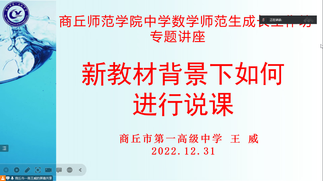 为培养师范生说课技能,提高师范生综合素质和专业技能,williamhill中国于12月31日晚七点在腾讯会议开展了“互联网+”中学数学师范生技能培训工作坊第五次集中培训——新教材背景下如何进行说课。此次培训由商丘市第一高级中学王威老师主讲,中学数学工作坊11位坊主,2020级辅导员姜素华以及2020级111位师范生参加了此次集中培训。