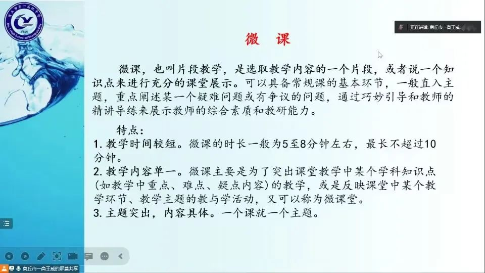 培训前,姜素华老师向同学们介绍了本次讲座的主讲老师王威老师,王威老师是一名长期奋斗在教学一线,拥有丰富说课经验并且获得多项教学荣誉的老师。培训开始,王威老师首先从全国大学生师范生技能大赛引入,大致介绍了比赛内容以及学院往届获奖同学,希望学员们可以积极参与此类活动。随后,王威老师简单讲述了微课和微型课的概念和特点,让学员们对微课和微型课有初步的了解。接着,王威老师阐述了说课的起源、基本要素、背景性要素、意义以及特点等多项相关内容,同时从“说课的解读”和“说课的程序”两方面进行分析,介绍了说课的定义、关键和理论依据,提醒学员们“说课”与“讲课”、“备课”和“上课”的区别,并详细讲解了说课的七个程序——说教材、说学情、说教法、说学法、说教学过程 、说板书设计、教学反思。最后,王威老师着重强调了说课的要求、说课中应该注意的问题以及说课的评价要点,展示了《椭圆及其标准方程》、《基本不等式》、《正弦定理》三个优秀说课实例,供学员们借鉴学习。培训结束后,姜素华老师进行了总结,对王威老师表示感谢,并勉励学员们多多练习,不断提升自己的说课技能。