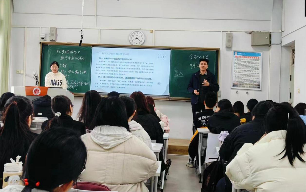 本节公开课围绕着如何在数学教学中揭示数学知识的本质展开,以问题为驱动,采取以小组为单位进行讨论、汇报,并随机抽取同学检验学生是否掌握所学知识点,针对学生回答的结果,老师进行点评与补充。通过采取这种混合式教学范式,实现课前、课中、课后一体化,让学生既获得了知识、又锻炼了教学实践能力,进而提升学生的教师专业综合素质。
