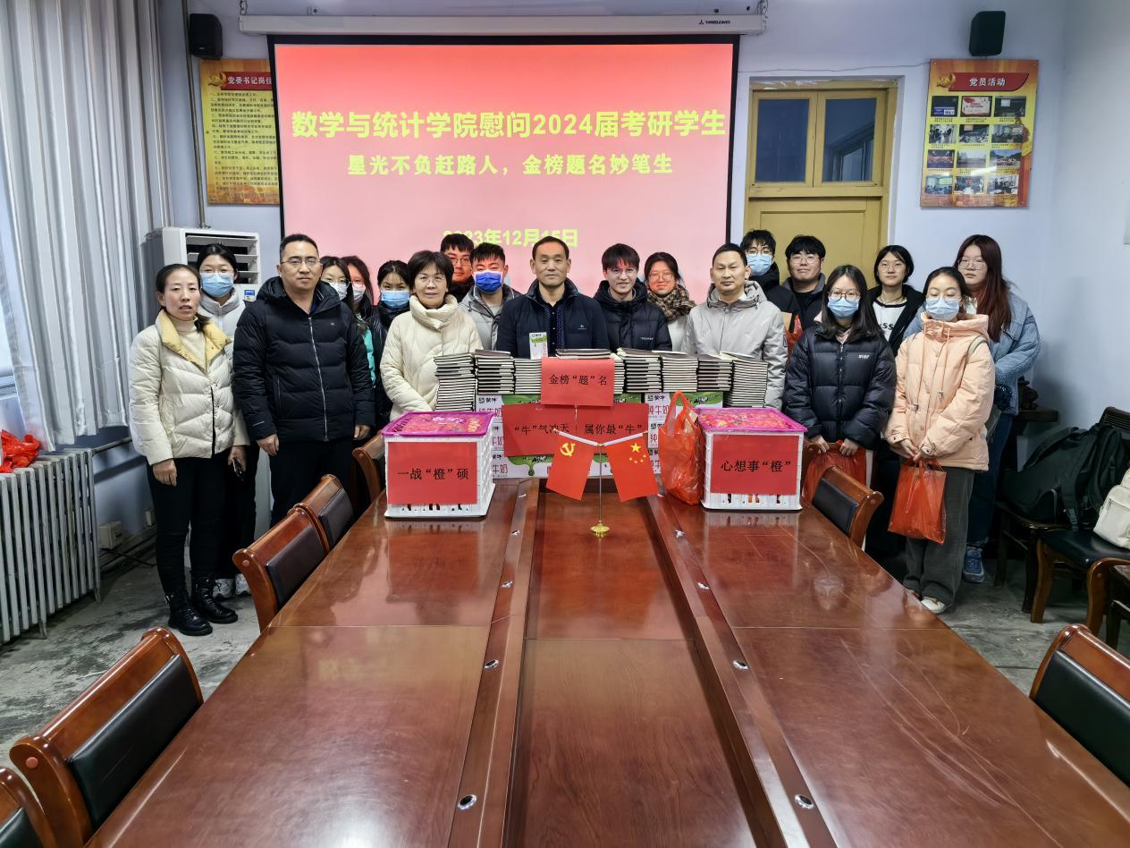 在2023年全国硕士研究生招生考试即将到来之际,为缓解考研学生备考压力,增强考研信心,williamhill中国于12月15日中午在数学办公楼204会议室举行考研慰问活动,院党委书记孟学超、院长张斐然、党委副书记陈树艳、副院长任磊、毕业班辅导员姜素华和15名学生代表参加活动。活动由党委副书记陈树艳主持。