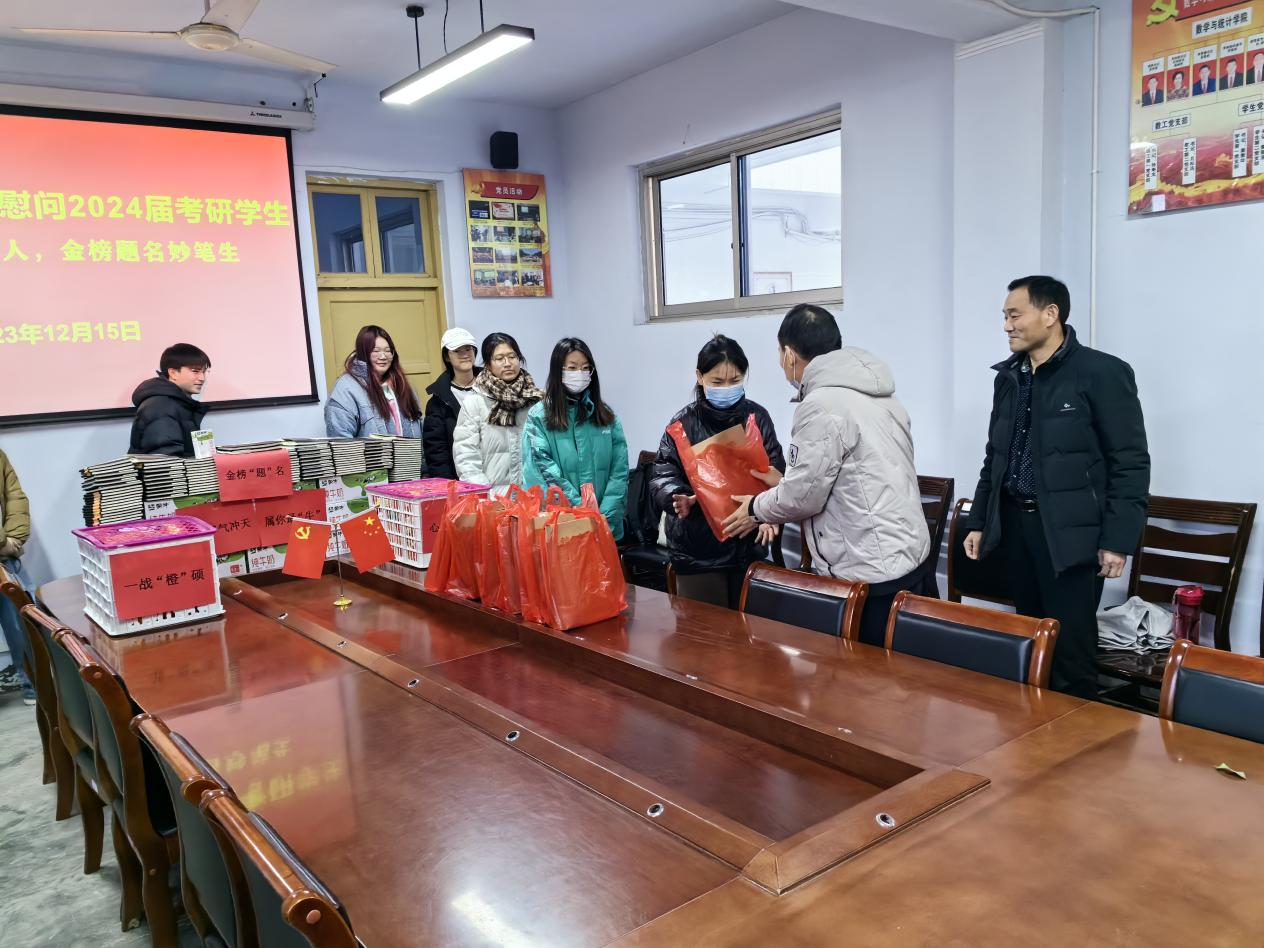 学院领导亲切询问同学们的复习和生活情况,对大家认真复习备考的精神表示高度赞扬,并代表学院给考研学子送上慰问品。慰问品中有文具、牛奶、鲜橙等含有吉祥寓意的物品。学院领导将精心准备的考研慰问品发放到学生的手中。将学院的美好祝愿送给学生,预祝他们金榜“题”名,“牛”气冲天、一战“橙”硕。