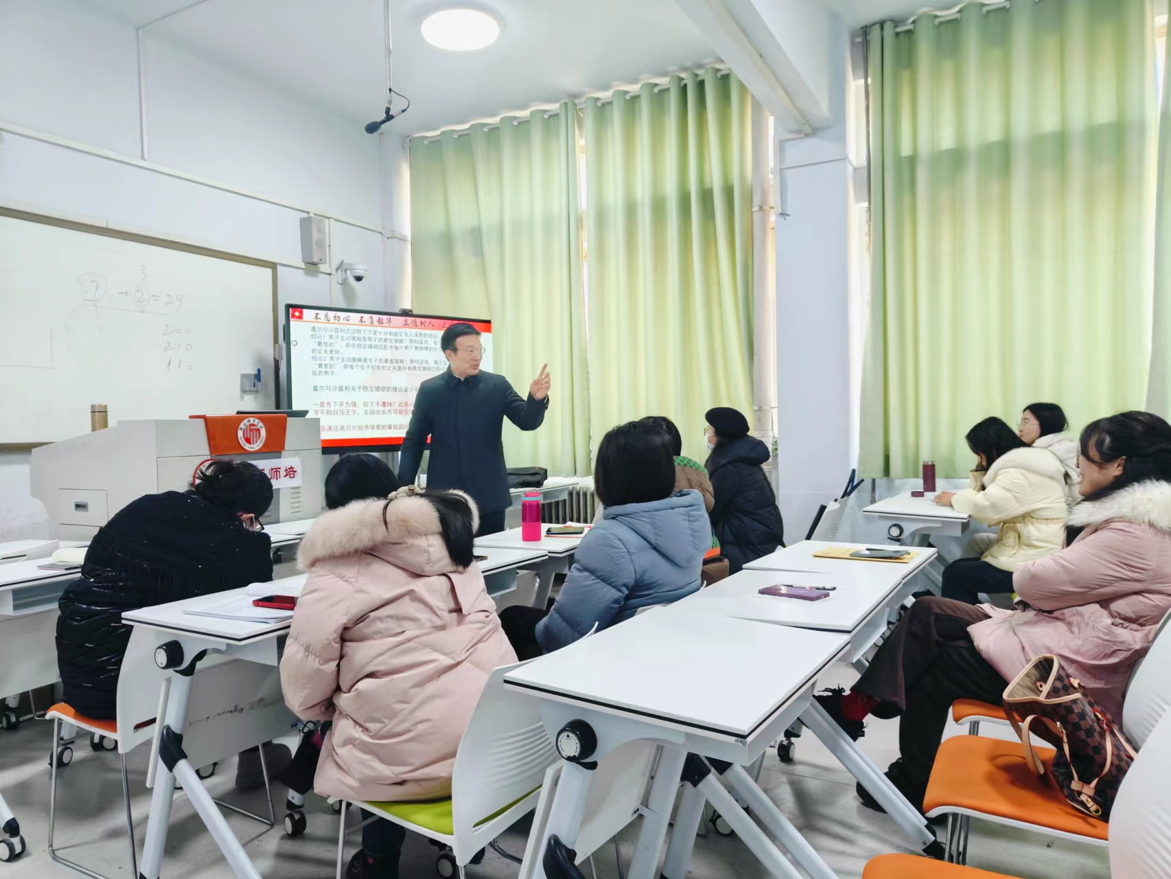 荆天首先介绍了数学的历史起源、数学文化的定义,他提出要从数学的角度看问题的出发点,解决问题和总结工作时,要运用逻辑推理的意识和能力,对所从事的工作,可以做到合理的量化和简化;接着,荆老师通过讲解学术和生活中的例子,让在场的老师感受到数学的魅力,并让大家积极地参与了讨论;最后,荆天引用数学大家华罗庚的名言,以及诺贝尔经济学奖获得者阿尔文·罗思的稳定匹配理论,强调学习数学知识的重要性。