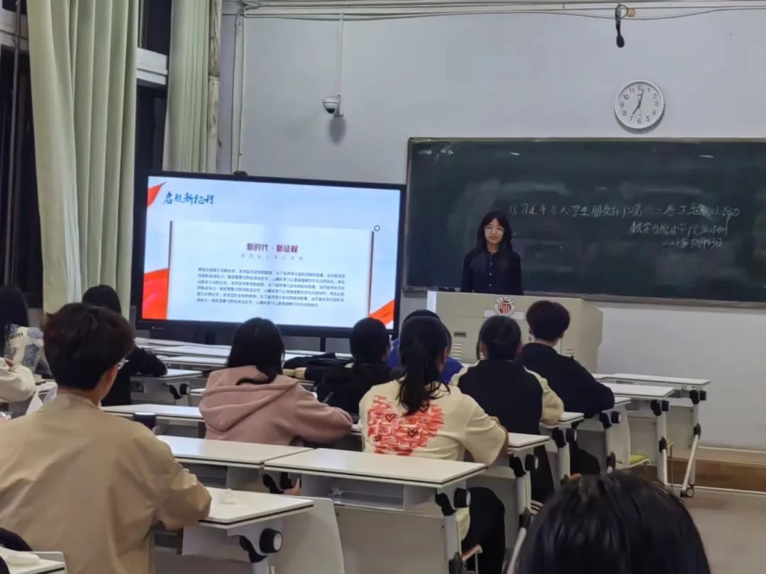 团日活动中,团支书向同学们介绍了本次活动的主题、内容以及目的,使同学们对活动有了初步了解。紧接着,团支书通过生动的讲述带领同学们回顾了习近平总书记在各地高校考察交流时,与大学生们相处的一个个温暖的瞬间。同学们全神贯注,沉浸在一个个生动的故事中,切实感受到了习近平总书记对青年一代成人成才的重视。随后,活动现场播放了相关的视频材料。视频中,习近平总书记和蔼的笑容和谆谆教诲感染了现场每一位同学,大家纷纷拿起纸笔,记录下内心的理想与信念。活动最后,团支书邀请多位同学上台分享自己的成长故事和奋斗经历。他们用自己的实际行动诠释了青春的价值和意义,同学们纷纷表示要以他们为榜样,积极进取、敢于担当、雕琢自身,成为能够担当民族复兴大任的时代新人!
