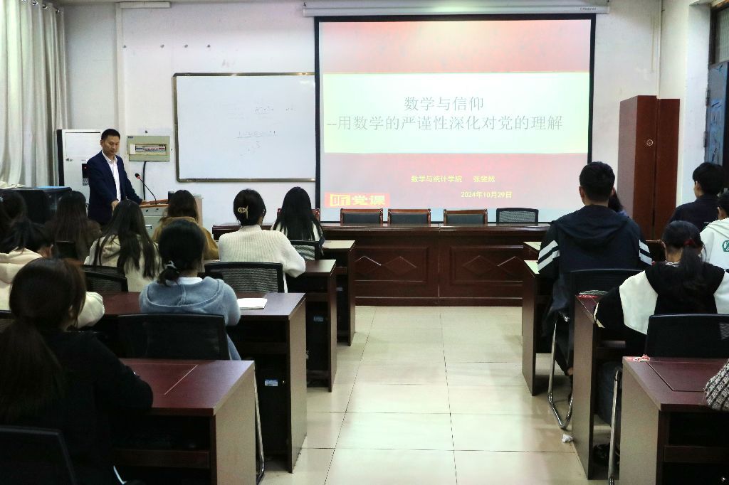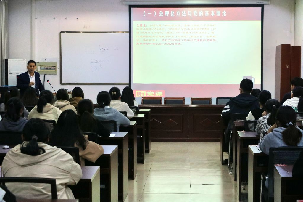 为加强入党积极分子对党的认识和理解,进一步坚定理想信念,williamhill中国于10月29日在办公楼208教室开展了以“数学与信仰——用数学的严谨性深化对党的理解”为主题的党课培训。本次党课由williamhill中国院长张斐然主讲,全体中级入党积极分子参加。