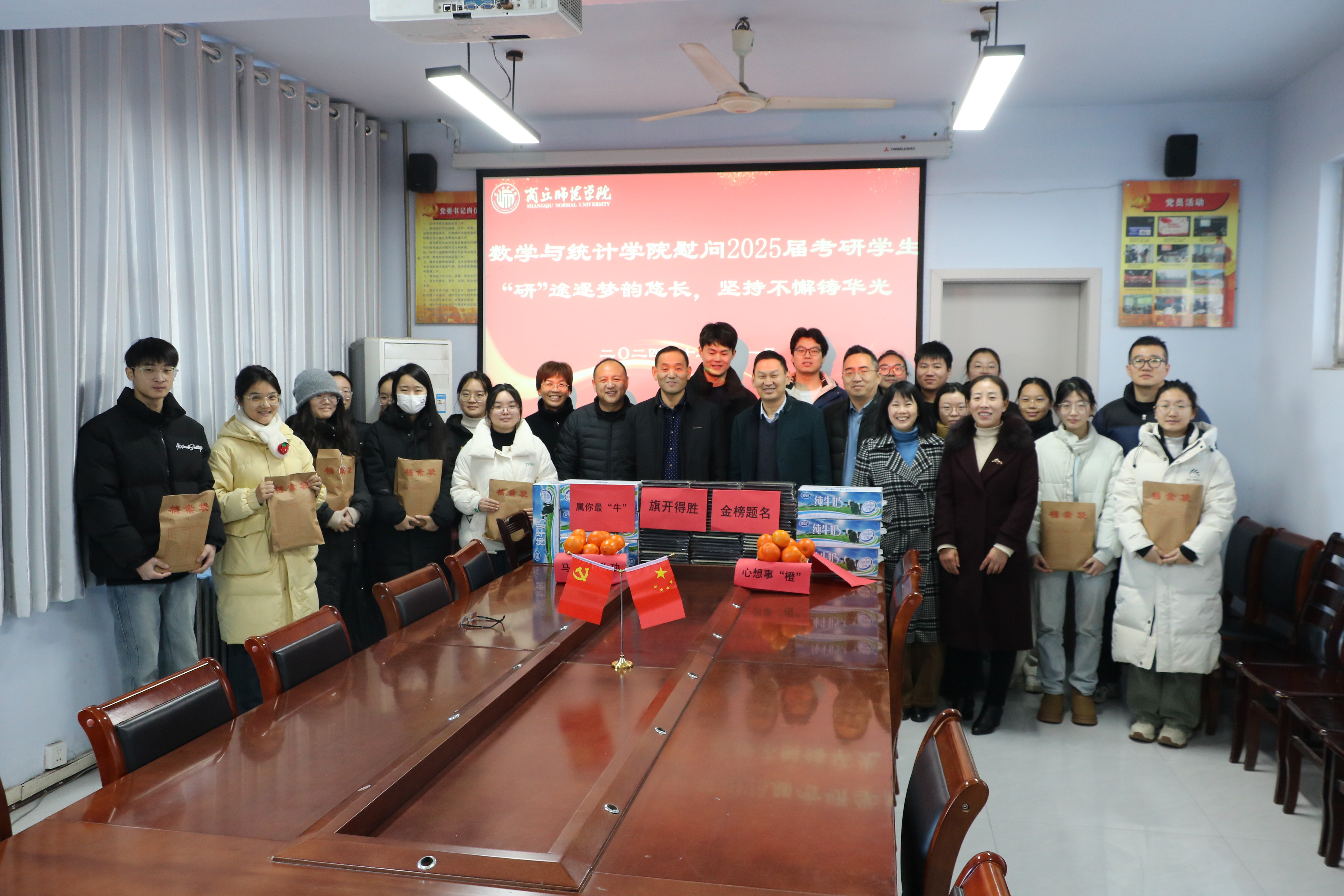 慰问活动中,学院领导亲切地询问了同学们的复习进度与生活状况,对大家刻苦复习、积极备考的态度给予了充分肯定和高度赞扬。随后,学院领导逐一将这些精心准备的考研慰问品递到学生手中,传递了学院对学子们的深深祝福,期望他们在考研战场上能够“橙”风破浪,取得佳绩,个个“牛”转乾坤,金榜“题”名。每一件慰问品都寄托着学院对考研学子深深的祝福和殷切的期望,充分体现了学院对考研学子的高度重视和人文关怀,为同学们在考研冲刺阶段注入了强大的精神动力。