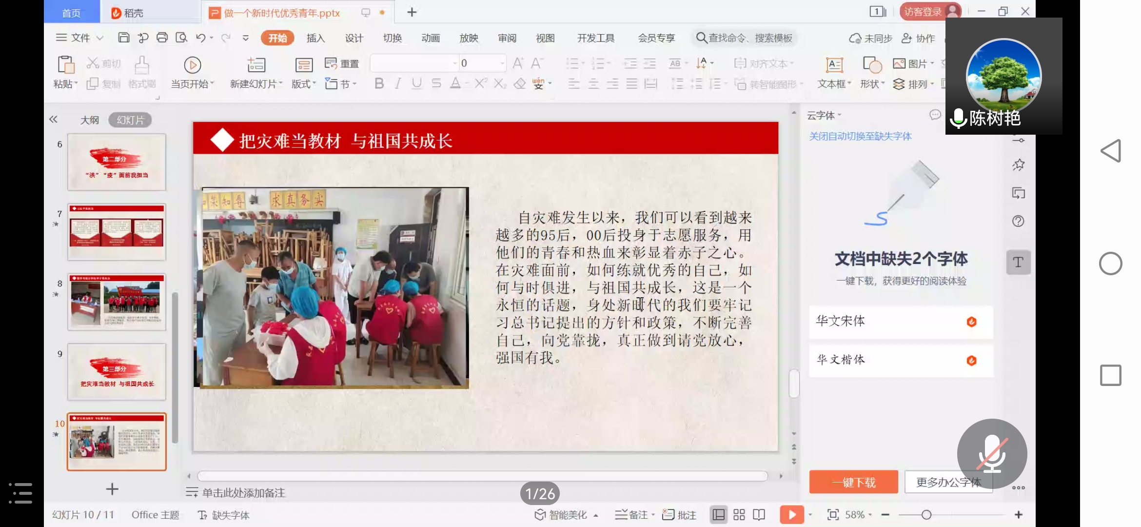 为进一步巩固“把灾难当教材 与祖国共成长”主题教育活动成果,持续把疫情灾情危机化为教育契机,9月1日上午,williamhill中国党委副书记陈树艳开展了以“把灾难当教材,与祖国共成长”为主题的线上党课,学院全体学生党员和入党积极分子参加了此次培训。