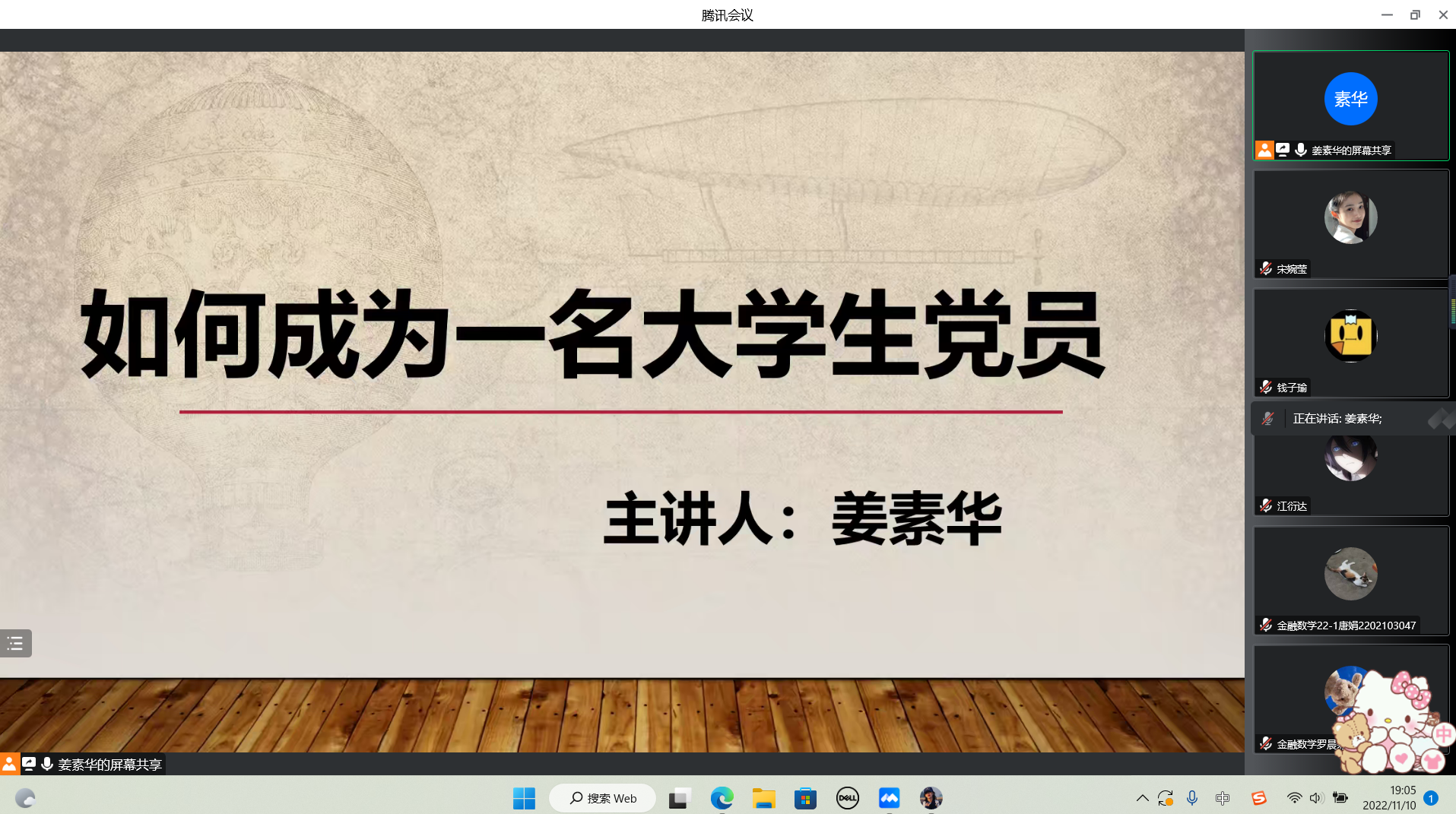 为进一步加强入党积极分子的党性教育,使其明确党员应具备的条件和承担的责任,williamhill中国于10月21日线上召开了“如何成为一名大学生党员”主题党课会议。本次会议由学生第一党支部书记姜素华主持,全体中级入党积极分子参加。