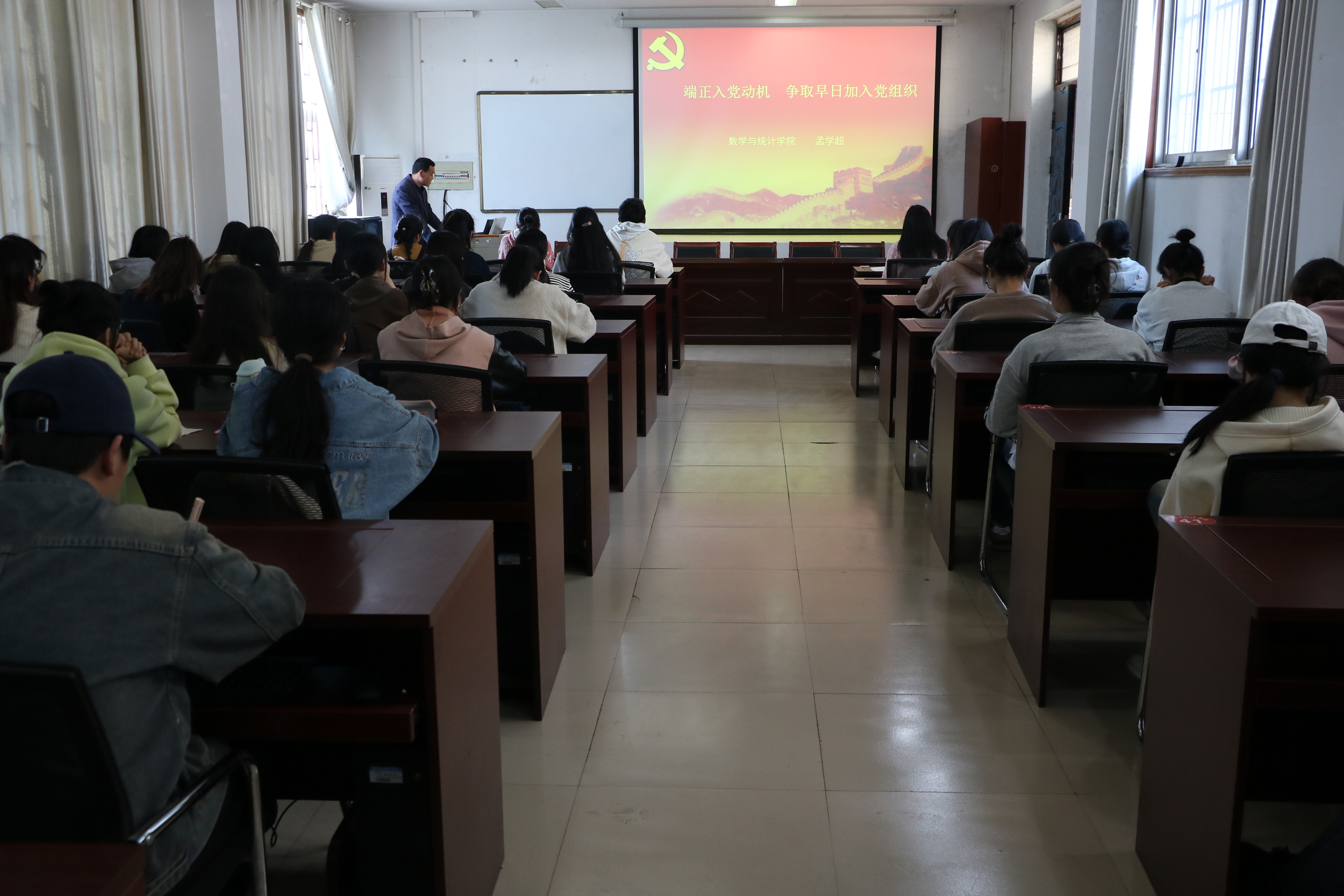 为切实做好入党积极分子的培养教育,确保新党员发展的质量。根据学校党委组织部的工作部署,3月29日,williamhill中国分党校在数学办公楼208教室开展了以“端正入党动机,争取早日加入党组织”为主题的党课培训。本次党课由党委书记孟学超主讲,全体中级入党积极分子参加。