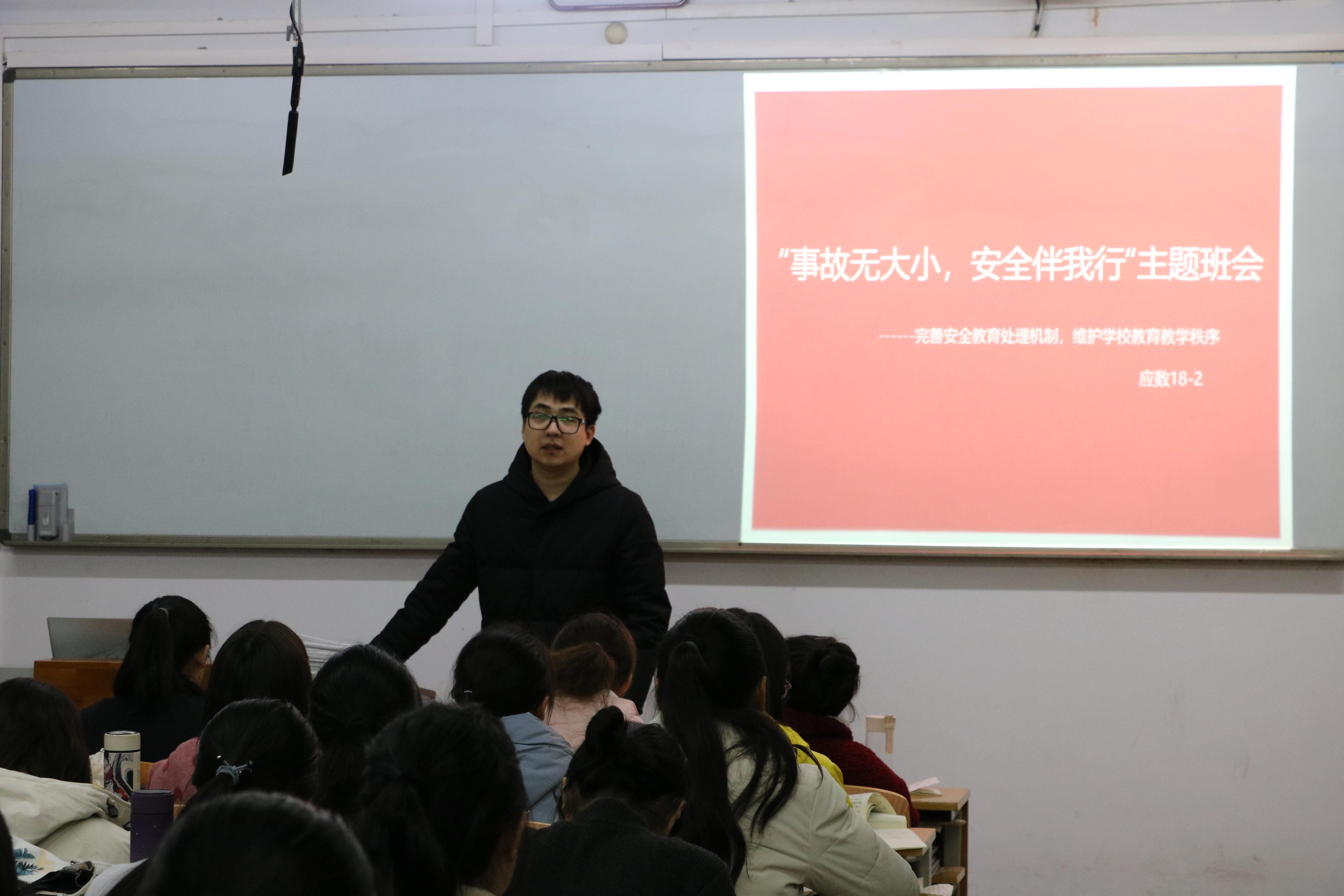 首先,全体学生认真学习教育部等五个部门关于完善安全事故处理机制,维护学校教育教学秩序的意见等文件。接着,辅导员从健全学校安全事故预防与处置机制,依法处理学校安全事故纠纷,及时处置、依法打击“校闹”行为,建立多部门协调配合工作机制这四个方面召开此次班会,并从法律层面进行教育,学习学校安全事故预防、学校安全事故处置程序、学校安全事故处理的法律服务机制、学校安全事故损害赔偿机制、学校安全事故纠纷协商机制和学校安全事故纠纷调解制度等内容。最后,从安全教育、法治教育、生命教育和心理健康教育四大方面出发,深入学校校舍、场地、消防、食品安全和传染病防控,通过视频向同学们讲述校园周边存在的一些安全隐患和校园安全常识。