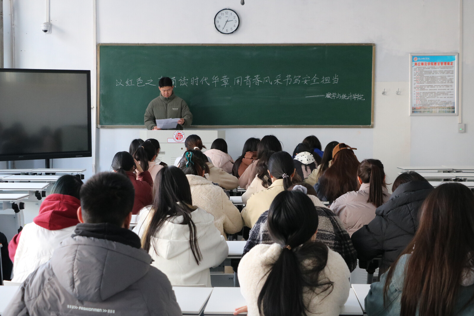活动伊始,程致远向大家介绍了活动目的和重要性,并结合近期国内外安全形势,强调青年学子应主动扛起维护国家安全的责任。随后,学生代表上台朗诵《青春中国》、《红岩》等红色经典片段,并播放同学们线上投稿的朗诵视频。朗诵者声情并茂,配合背景屏幕上滚动的历史影像,将气氛推向高潮,使观众仿佛置身于革命年代的峥嵘岁月。最后,为增强活动的参与感和互动性,程致远引导大家积极讨论、互相交流,分享自己对安全的看法和建议并通过投票选出优秀朗诵者。