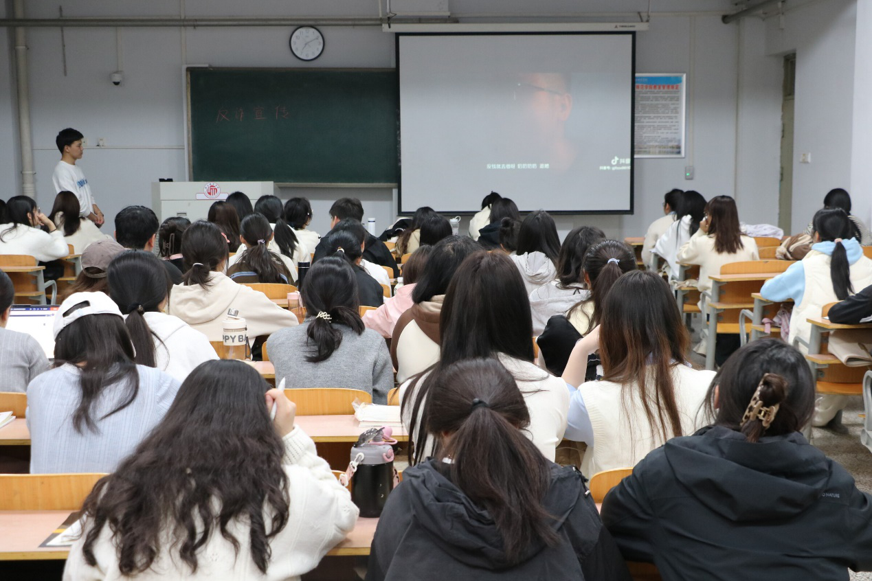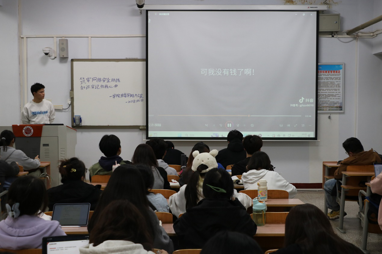 活动伊始,学生以班级为单位观看了安全防范教育视频,学习了网络安全专家对网络诈骗、信息泄露、恶意软件等常见网络风险的解读,以及相应的防护措施。教育视频通过真实生动的案例和深入浅出的讲解,将原本复杂的安全知识以直观的方式呈现给同学们。随后,设置了安全知识问答环节,同学们踊跃参与。此外,各班还邀请了几位同学上台分享自己的故事和应对经验,以亲身经历警示大家安全防范的重要性。