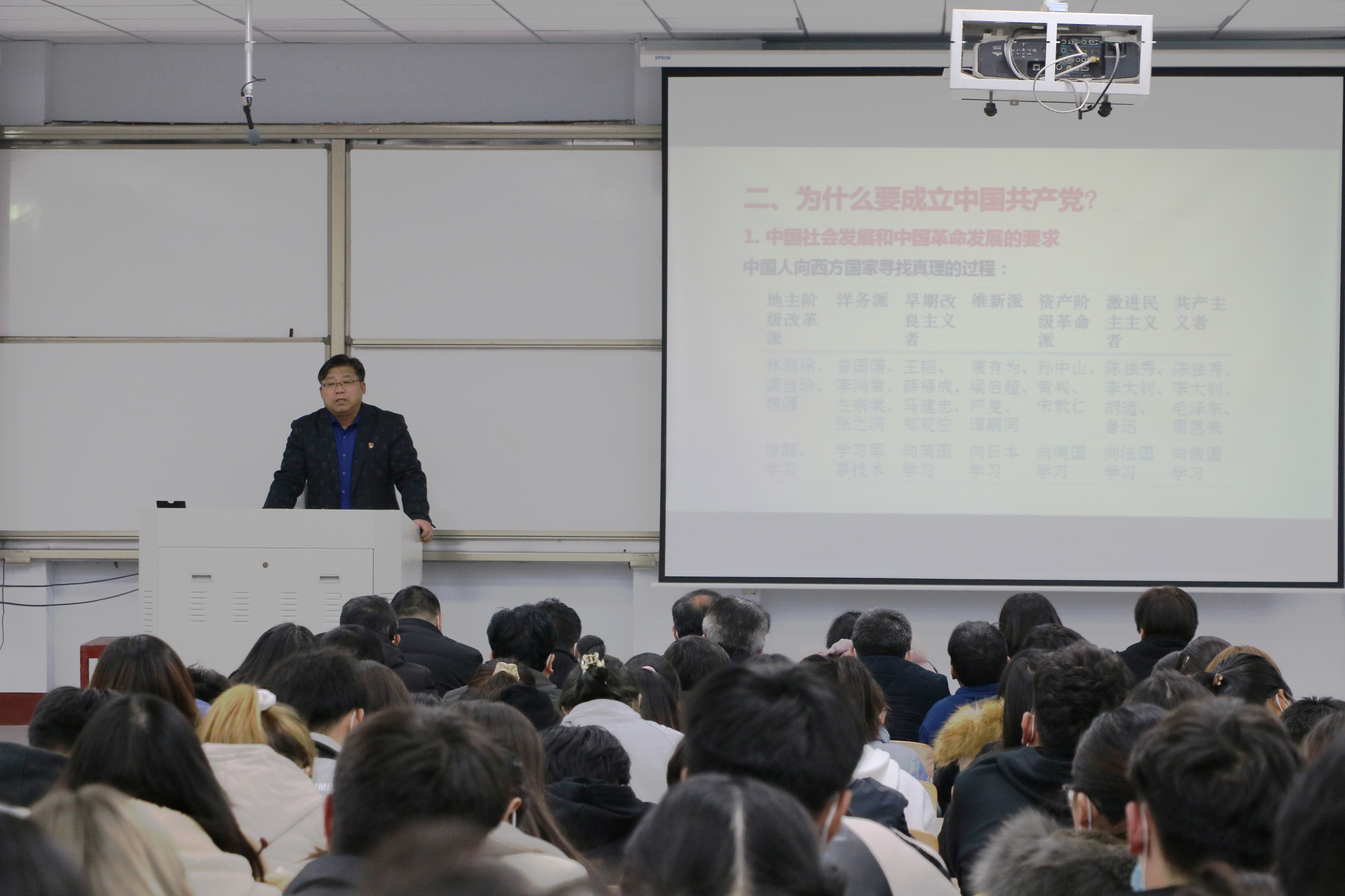 李东坡教授从为什么学习中共党史、为什么要成立中国共产党、党的光辉历程和中国共产党取得伟大成就的原因等四个方面阐述了一百年来中国共产党取得的伟大成就。由中国共产党以史为鉴,明得失,知兴替引出学习中共党史的重要意义;随后,李东坡教授借详实的史料深刻揭示了中国共产党成立的必要性和必然性;回顾了中国共产党在新民主主义革命时期、社会主义革命和建设时期、改革开放和社会主义现代化建设时期的探索和成就,着重讲述了中国共产党的伟大历史贡献和根本成就;最后,李东坡教授指出共产党人坚持以科学理论为指导,不断进行自我革命是中国共产党取得伟大成就的重要原因。