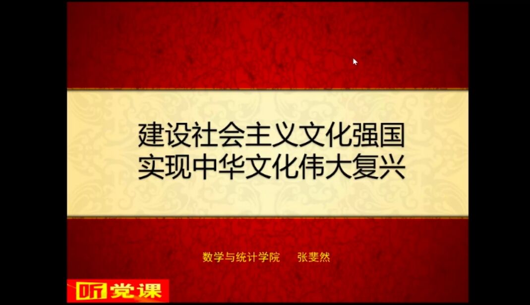 为使社会主义核心价值体系深入人心,增强同学们的文化自觉和文化自信。williamhill中国于4月1日晚7点线上召开了“建设社会主义文化强国,实现中华文化伟大复兴”为主题的中级入党积极分子党课培训会议。本次党课由院长张斐然主讲,全体中级入党积极分子参加。