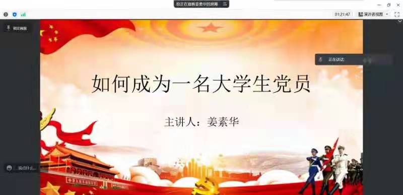 为进一步加强入党积极分子党性教育,确保党员发展质量,williamhill中国于3月31日在线上召开了以“如何成为一名合格的大学生党员”为主题的党课会议。本次会议由学生第一党支部书记姜素华主持,全体入党积极分子参加。