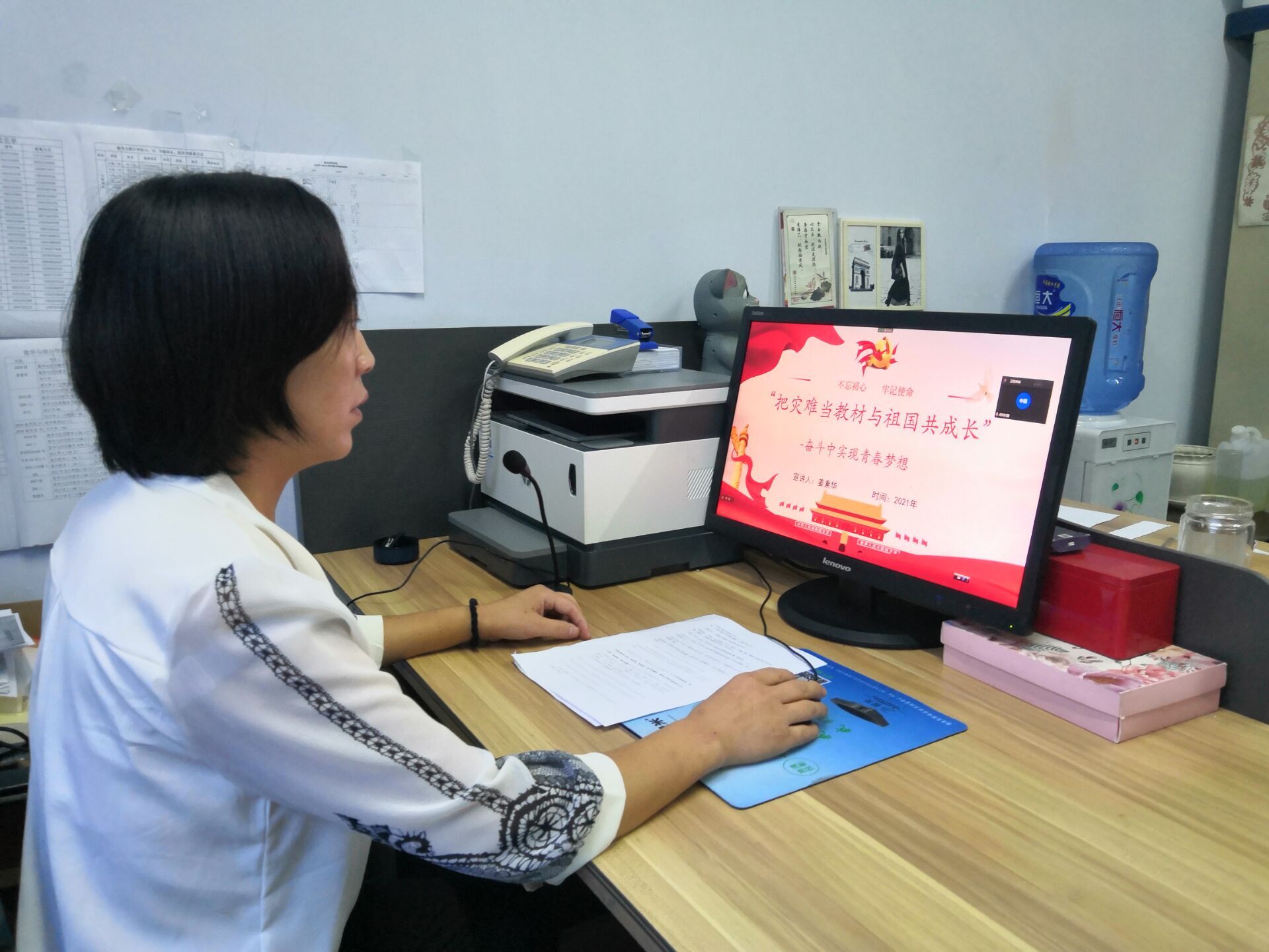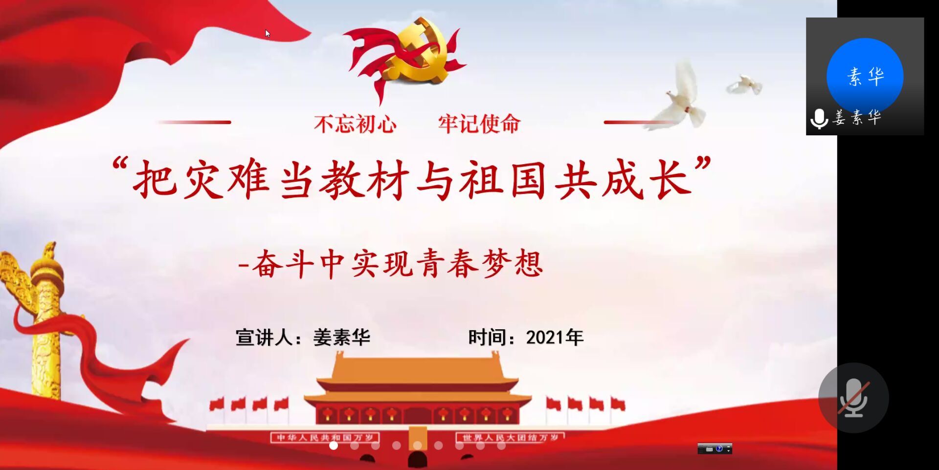 姜素华老师结合面对病毒和自然灾害的侵袭、百年未有之大变局的加速演变,当代青年梦想如何绽放、人生如何出彩,从坚定远大理想、勇挑时代重担、坚持踏实躬行、矢志艰苦奋斗四个方面讲述青年学生应如何做合格的社会主义事业接班人和建设者。最后,姜素华老师向学生党员介绍了上世纪30年代秉持家国情怀和时代理想,坚持以自身所学保卫人民,报效祖国的中华热血青年们,并指出当代青年学生应让自己的人生规划紧扣时代脉搏,呼吁学生党员们珍惜来之不易的生活,充分利用时间,努力学习,不断加强爱国主义精神,为未来祖国建设发展贡献出自己的一份力量。