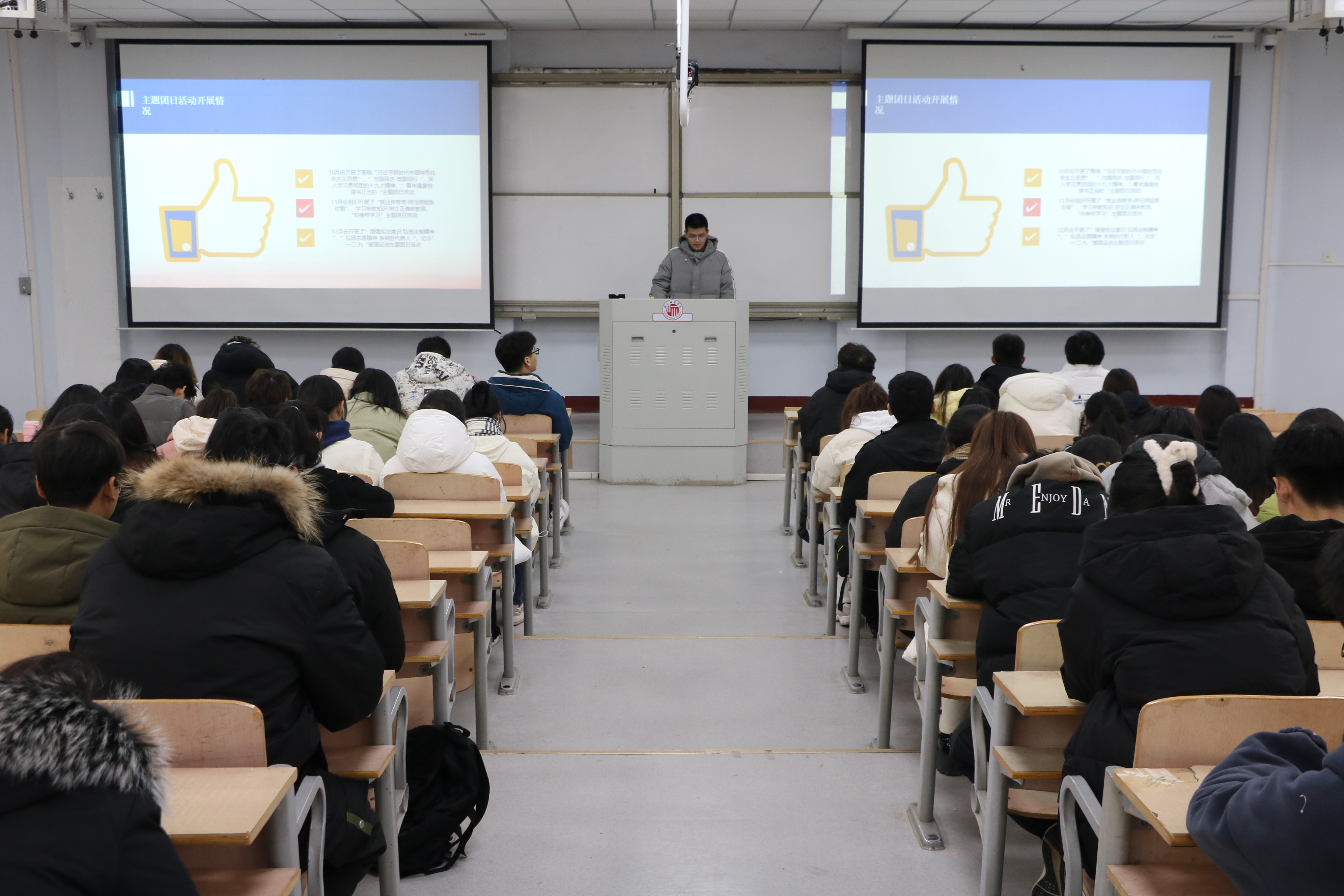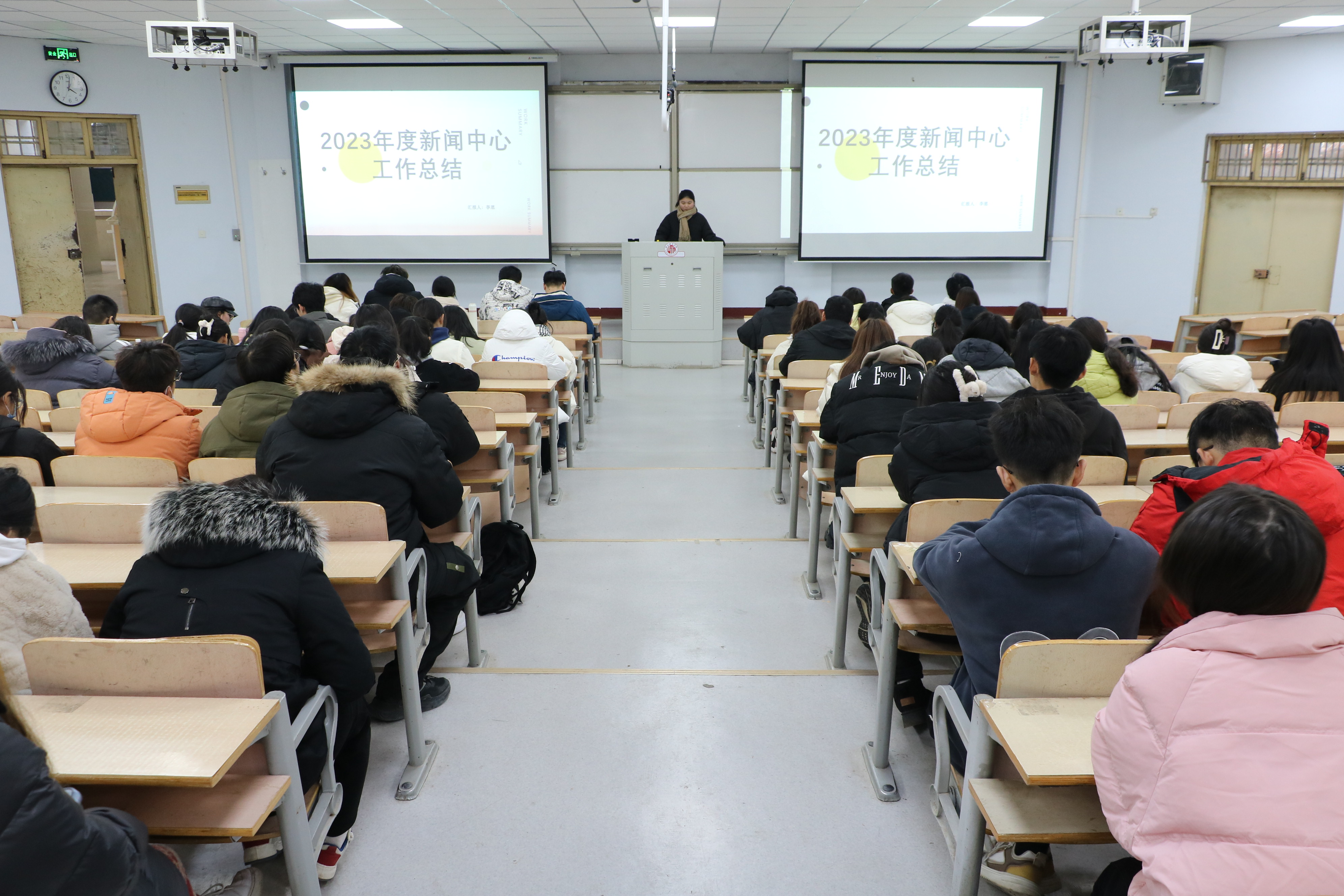 大会开始,由团委学生会各部门代表依次结合PPT进行述职汇报,对本学期部门工作进行了详细的总结和阐述。在汇报过程中,各部门代表回顾总结了本部门的工作开展情况,认真剖析了工作中存在的问题和不足,并制定了下一步工作改进计划和措施。同时,各部门代表表示未来工作将继续秉持“全心全意服务同学”的宗旨,注重团队协作,增强部门之间的凝聚力,不断完善,不断超越,为同学们提供更高质量的服务。