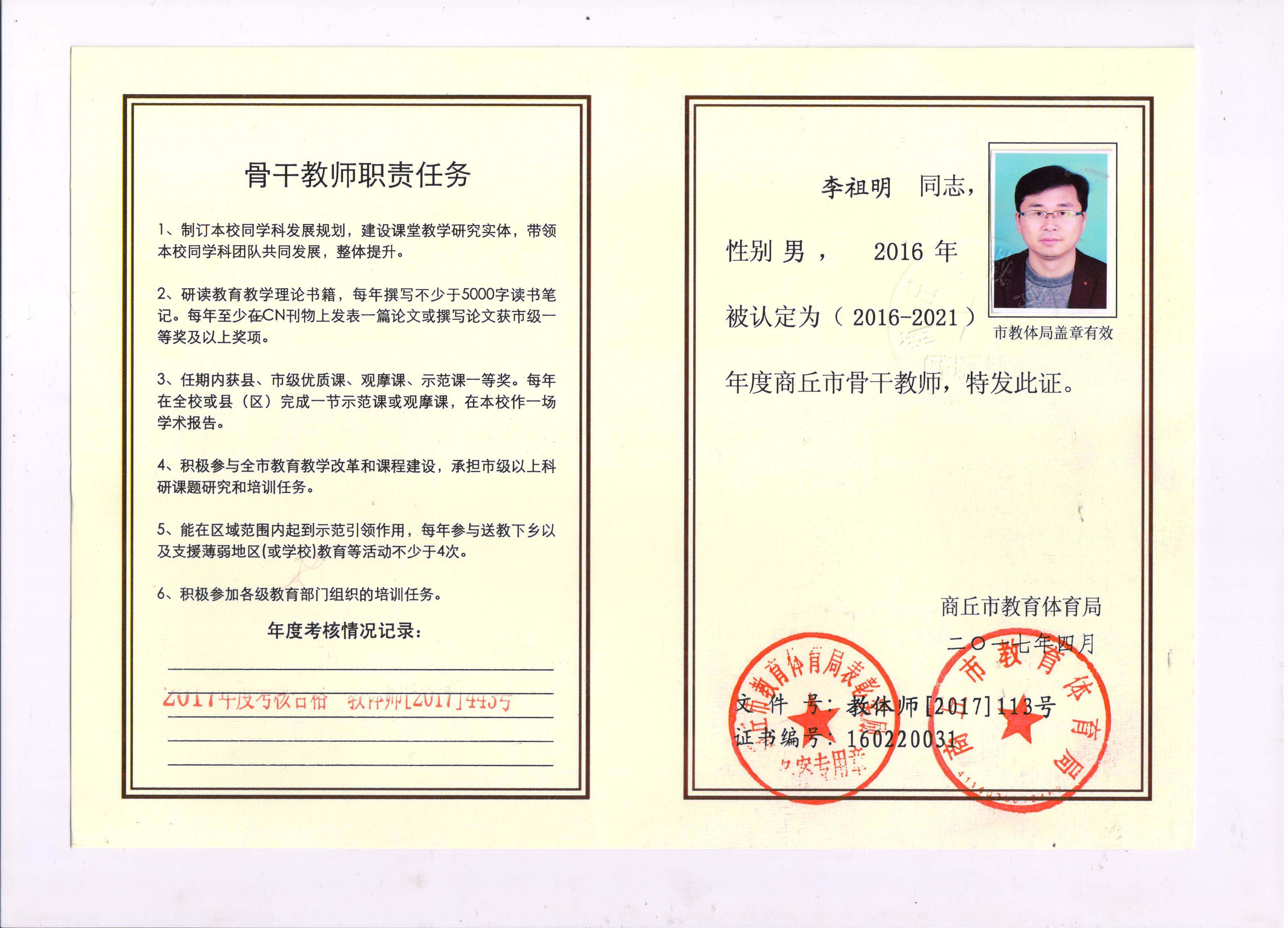先后荣获:河南省教育厅学术技术带头人,商丘市骨干教师,商丘市优质课一等奖,商丘市优秀班主任,商丘市教育信息技术应用名师,全国数学竞赛、河南省数学竞赛优秀辅导员 、2015年度感动中原十大人物商丘市候选人、2016年度河南省最美教师商丘市唯一候选人。