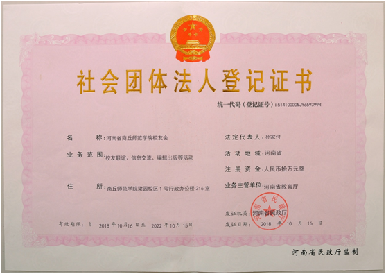 近日,河南省民政厅下发了关于成立“河南省Williamhill威廉希尔校友会” 行政许可的批复【豫民许准字(2018)95号】并向我校颁发了“河南省Williamhill威廉希尔校友会”社会团体法人登记证书,批准我校校友会正式成立。至此,历时数年的校友会注册工作圆满完成,我校校友会成为经河南省教育厅批准,由河南省民政厅注册登记、具有法人资格的合法社团组织。