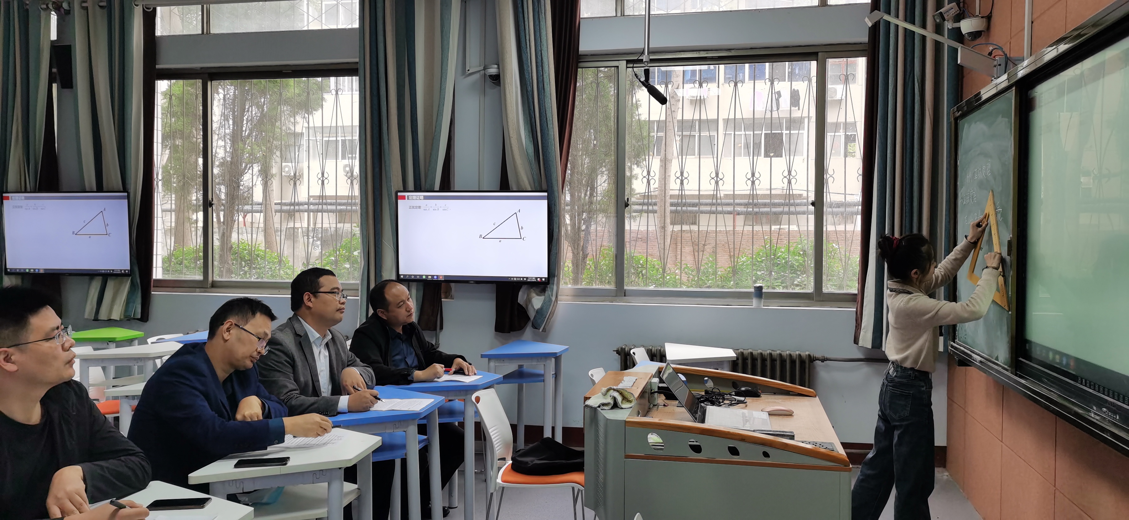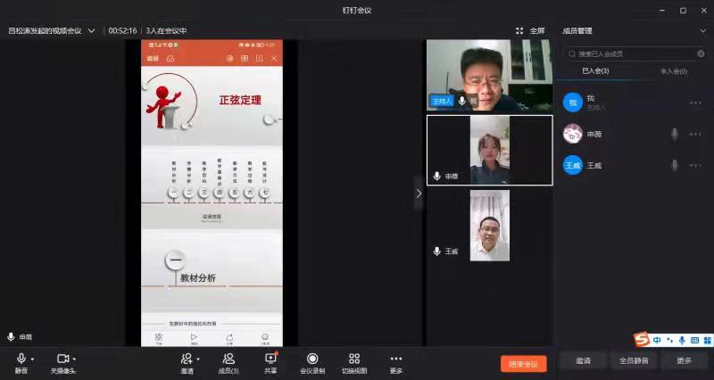 受疫情影响,为做好本次竞赛的准备工作,学院首先通过线上组织学生开展了参赛选拔工作,通过层层选拔,最终确定参赛选手为应数18-2班申薇同学。为了提升参赛选手的中学数学课堂教学实操能力,学院特邀商丘第一高级中学一线教学名师王威老师,协同我院吕松涛老师对申薇同学进行联合培养。由于疫情期间学生不能返校,指导教师克服困难,采取腾讯会议的形式,多次线上对申薇同学进行教学指导。学生返校后,10月10日吕松涛老师和王威老师在睢阳校区1号教学楼110教室对参赛选手申薇进行了专项培训,从教学设计、课件制作、教学方法等方面对申薇所讲授的《正弦定理》进行指导并提出改进建议,帮助学生优化了讲课和说课内容。