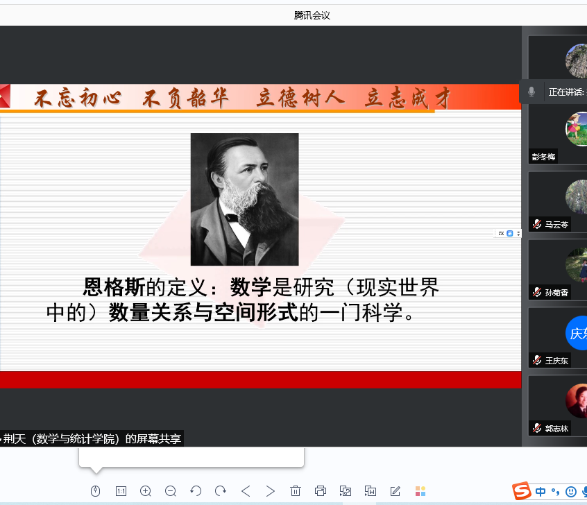 为将课程思政落实到课堂教学,10月28日晚,数学与应用数学系通过腾讯会议进行课程思政观摩课活动,活动由系主任张海燕主持,系全体教师参加。