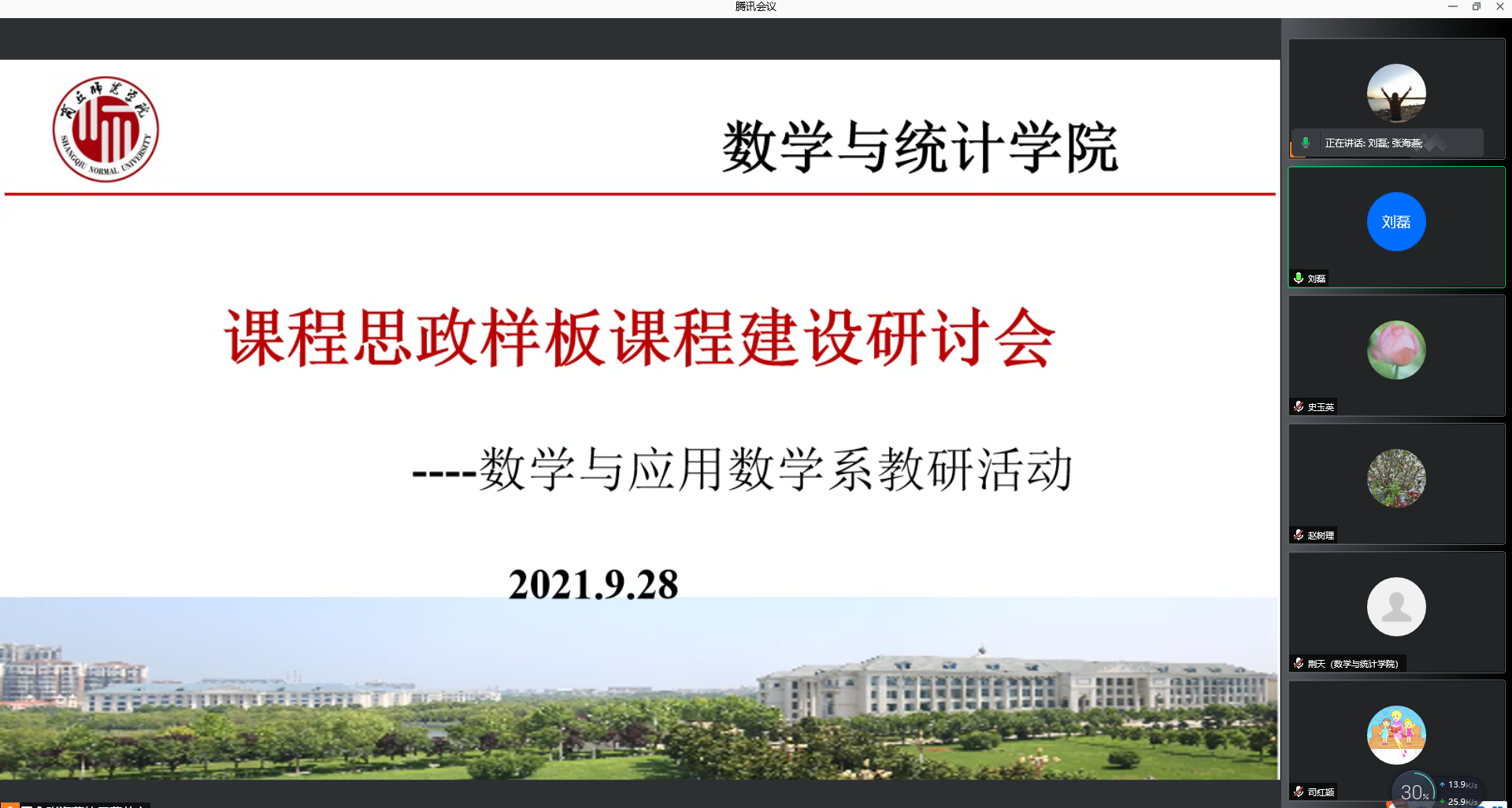 会上,由获得此次校级样板课程的课程负责人郭志林教授和孙菊香博士为大家分享课程思政建设的经验。郭志林教授主要从《高等数学》课程思政建设的指导思想、教学设计的思路、育人目标和思政元素的融入点等方面,进行了详细介绍,郭志林教授还重点强调了将思政元素与学科知识讲授恰当融入的重要性,要注意教学方式方法要灵活,不能生搬硬套。孙菊香博士为大家介绍了《高等代数》课程思政建设的理念和思路,从数学家故事、数学发展史、数学概念和思想等方面充分挖掘思政素材,将政治认同、国家意识、文化自信、公民人格等思想融入课程教学中。通过两位老师的精彩报告,大家对如何课程思政有了更进一步的认识,同时也激发了大家对课程思政建设的热情。随后,系全体教师对思政资源探索与思政元素的有机结合、思政元素的有效融入课堂教学等方面进行了热烈的讨论。