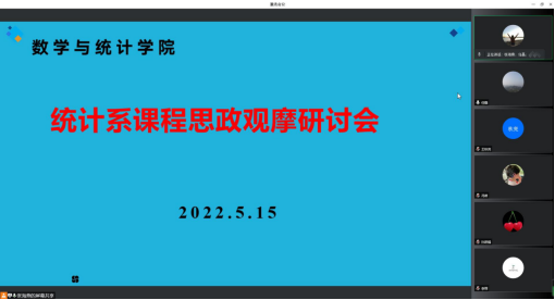 为将课程思政更好落实到课堂教学并持续改进,5月15日上午,统计学系通过腾讯会议开展课程思政观摩研讨活动,此次活动由任磊老师主持,系全体教师参加。